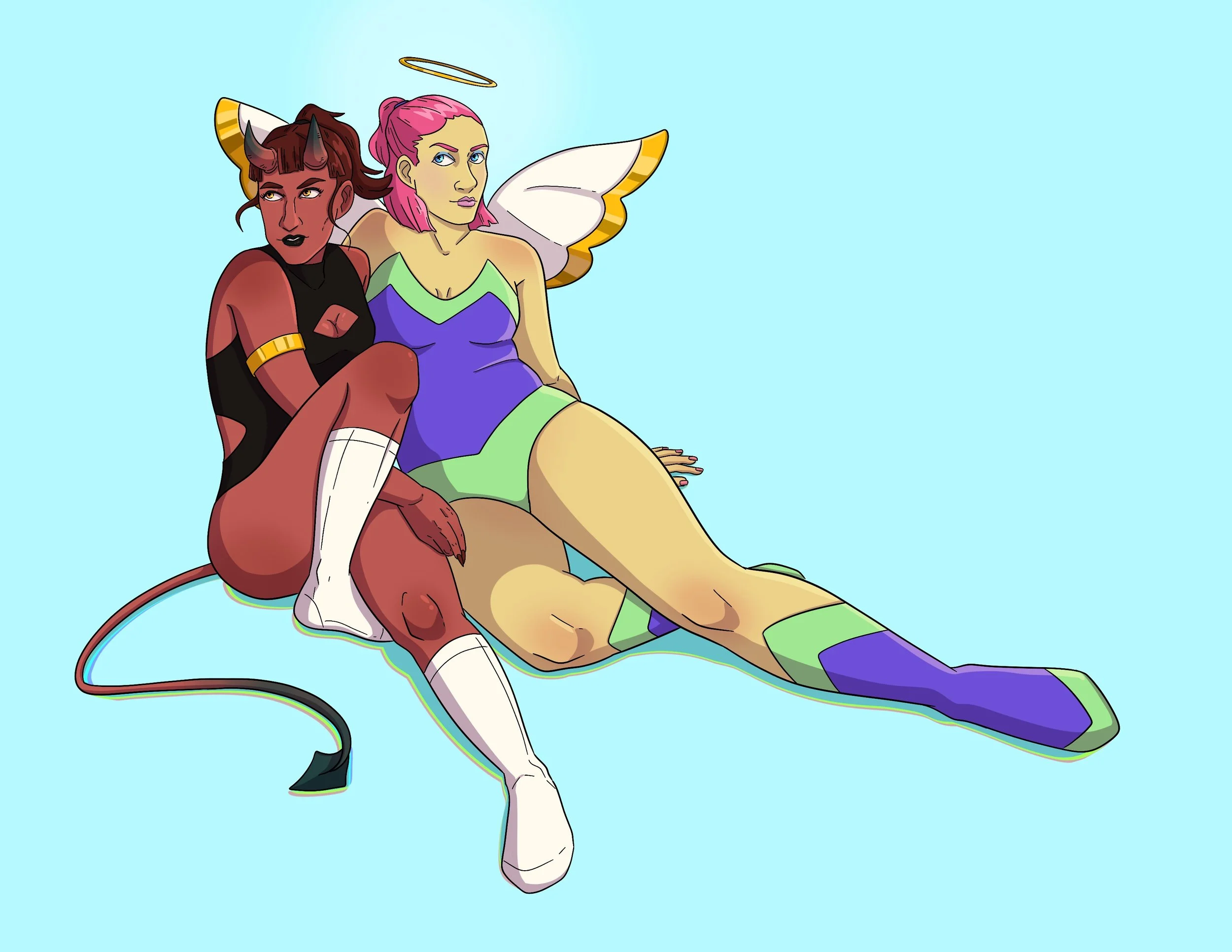 Illustration of two women dressed as a devil and angel, sitting together, with a light blue background.
